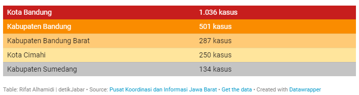 Adapun sebarannya yaitu Kota Bandung 1.036 kasus, Kabupaten Bandung 501 kasus dan Kabupaten Bandung Barat 287 kasus. Kemudian Kota Cimahi 250 kasus serta Kabupaten Sumedang 134 kasus.
