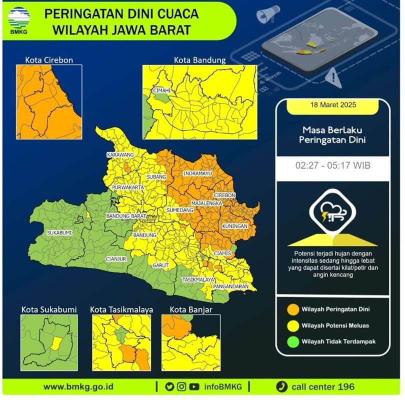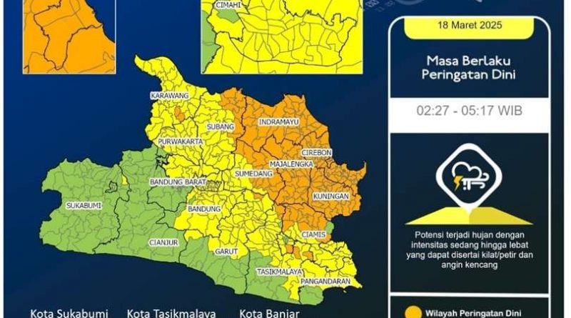 Terasjabar.co – Badan Meteorologi, Klimatologi, dan Geofisika (BMKG) dan Badan Penanggulangan Bencana Daerah (BPBD) Provinsi Jawa Barat merilis peta peringatan dini terjadinya hujan lebat disertai petir di wilayah utara Jabar, di antaranya Indramayu, Cirebon, Majalengka dan Kuningan.